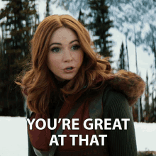 Karen Gillan as Ruby Roundhouse delivers the line 'You're Great At That' in a snowy Jumanji scene.