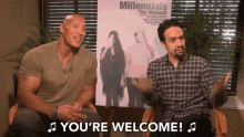 Dwayne Johnson gestures while saying 'You're Welcome!' next to a 'Millennials The Musical' poster.