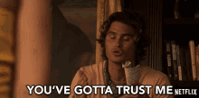 Chase Stokes as John B from Outer Banks saying 'You've gotta trust me' while holding a book.