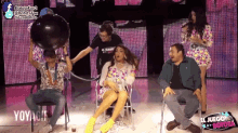Yoyagif and others play 'El Juego de la Botota' game show, with a large balloon and confetti.