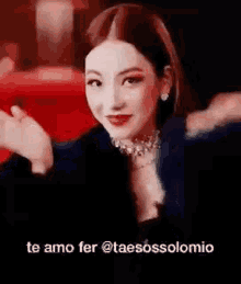 Karina from Aespa waves and smiles, wearing a black jacket and a sparkling necklace.