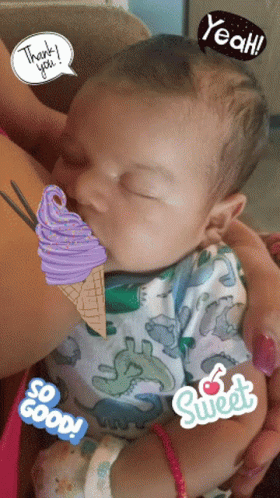 A cute baby with a dinosaur onesie appears to be enjoying a purple ice cream cone, with playful captions.