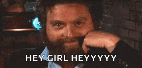Zach Galifianakis smiles and says 'Hey girl hey' directly to the camera, making a hand gesture.
