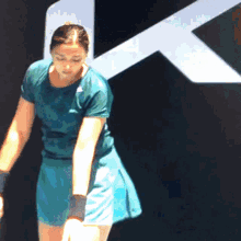 Zarina Diyas prepares to serve during a tennis match on a blue court in Melbourne.