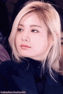 Close-up of a woman with blonde hair and light makeup, wearing a dark top, with 'lookatafterschool.tumblr' watermark.