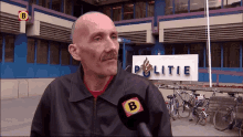Man with a mustache interviewed outside a police station regarding a 'Ziekenhuisbal' suspicion and match-fixing.