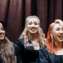 Zpop Zgirls group laughing and reacting with joy in front of a red curtain, showcasing their lively energy.